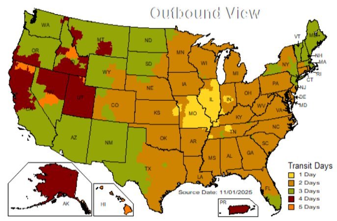For UPS Ground shipments, the map in Figure 1 (Updated 2024) illustrates the approximate time-in-transit.