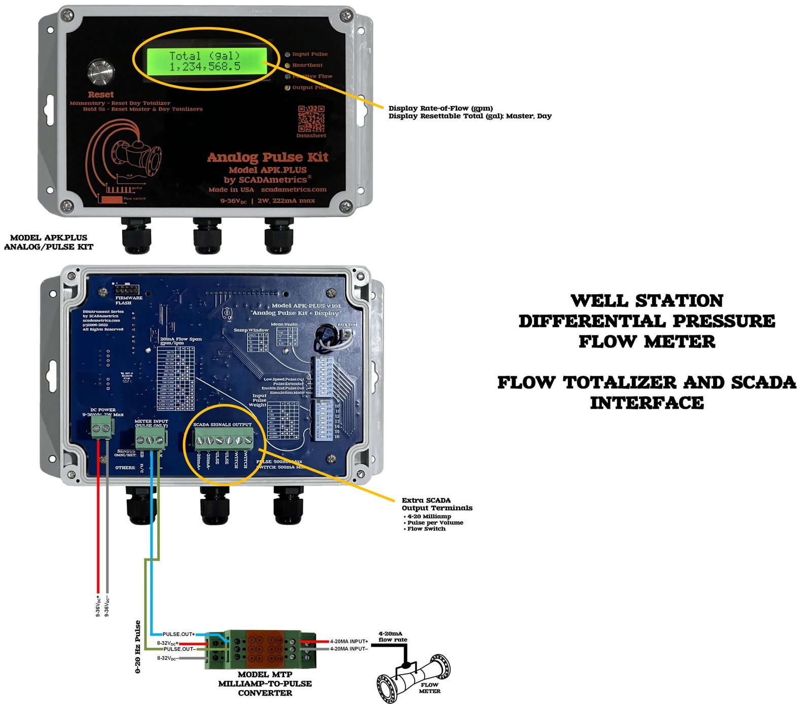 SCADAmetrics offers a hardware-based solution that does not require a PLC programmer, nor a PLC; and it is based upon two devices: The SCADAmetrics model MTP Milliamp-to-Pulse Converter, and the model APK.PLUS Analog/Pulse Kit.