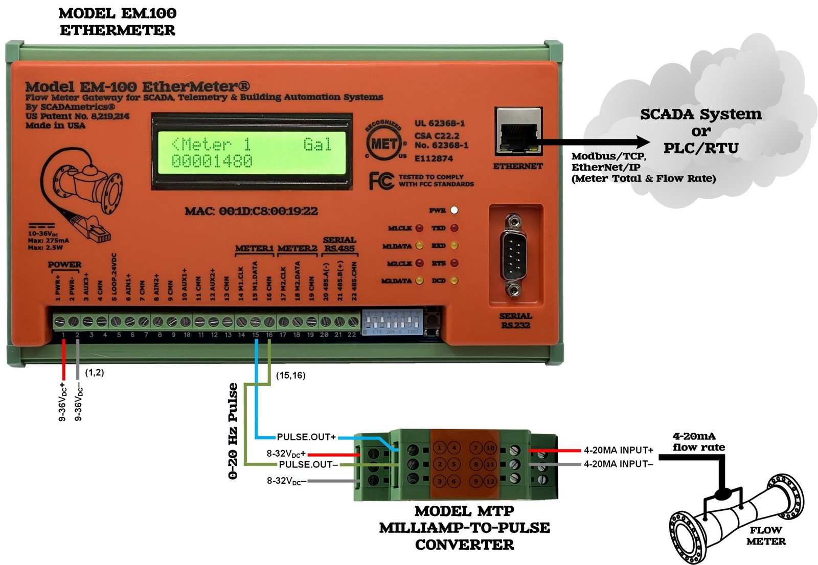 Instead of the APK.PLUS, a SCADAmetrics model EM.100 EtherMeter can be utilized to provide a fieldbus SCADA solution. The following diagram illustrates the connections (click to zoom):