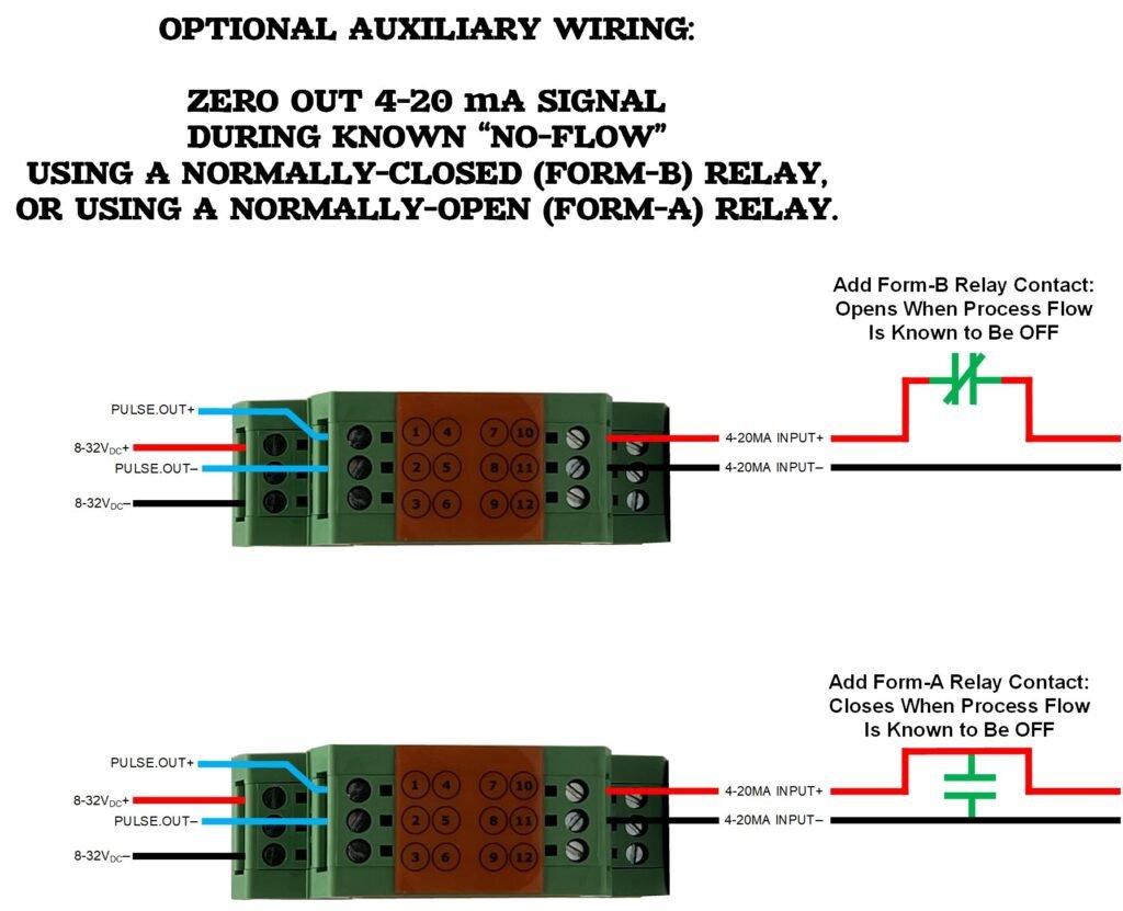During no-flow conditions, it may be necessary to null out the 4-20mA signal so that the totalizing function does not integrate very-low-level flow signals. In other words, if the 4 milliamp signal is interpreted as 4.001 mA, then slowly creeping integration errors would accumulate. In such cases, it would be preferable to treat that as an absolute “no flow” condition, and a relay could be added to the input circuit of the MTP to enforce interpretation of “no flow” as 0.000 mA. For example, at a pumping station, the form-A or form-B relay could be controlled by an auxiliary contact of a pump motor starter or VFD.