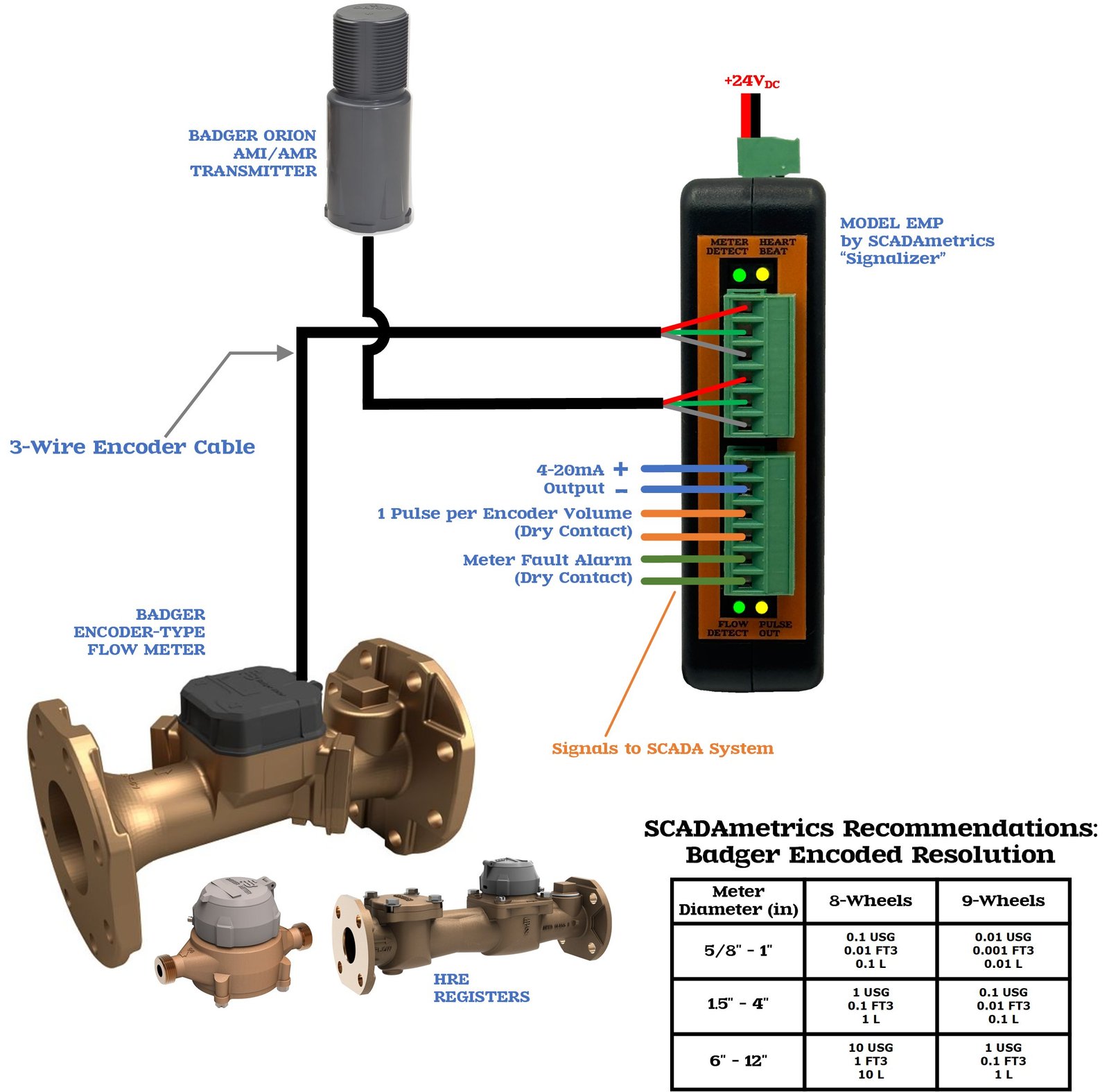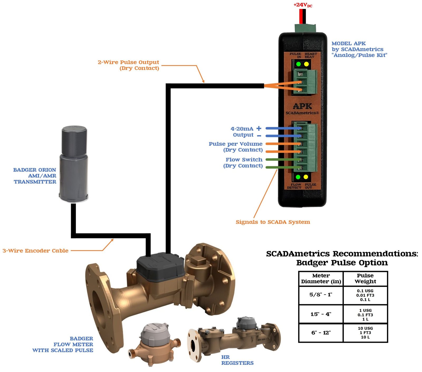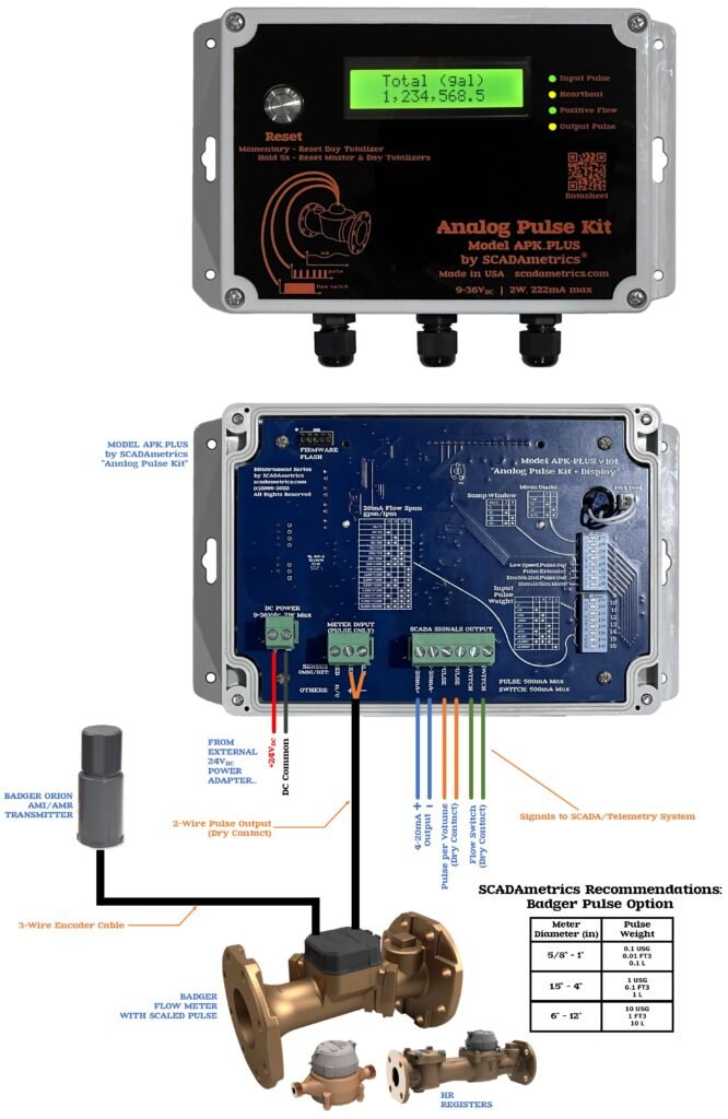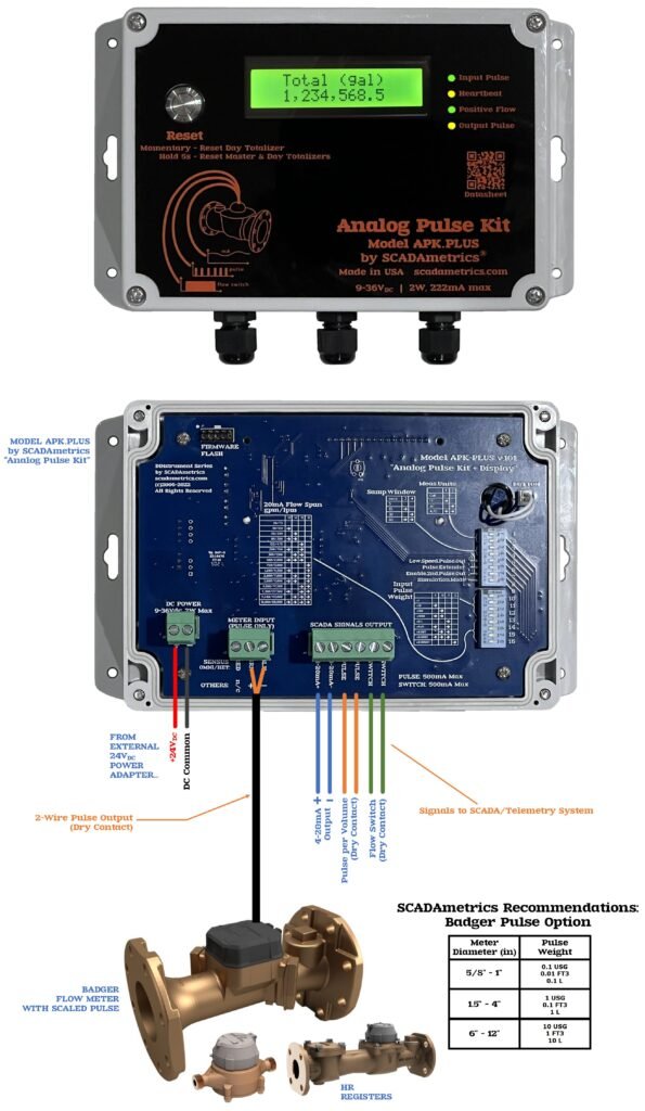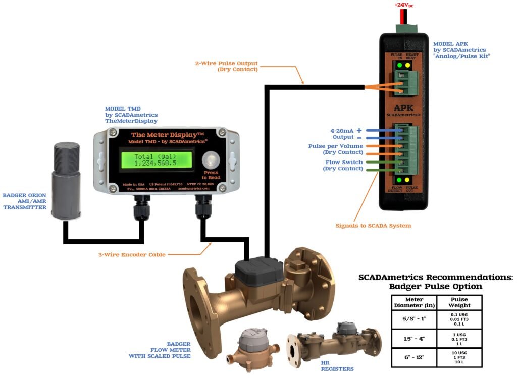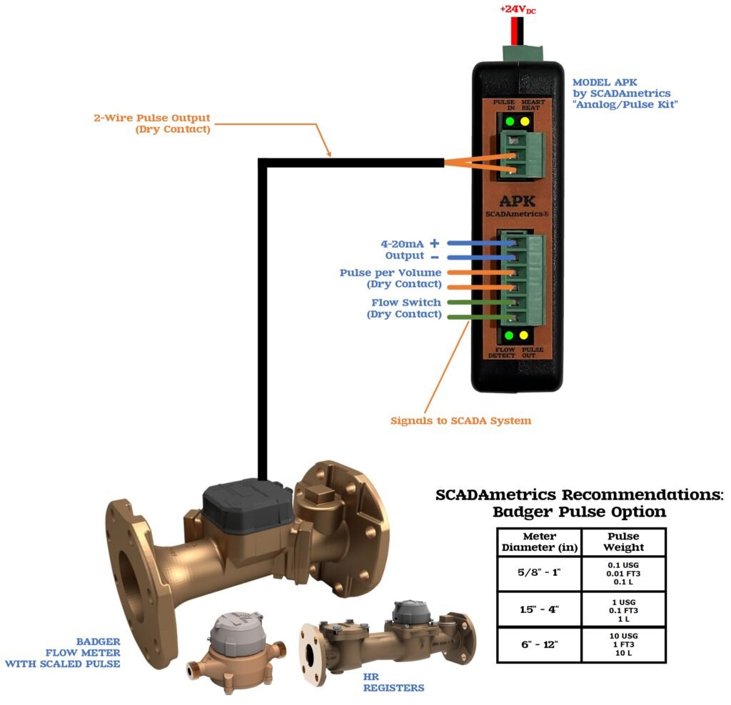 The following illustrates how a Badger pulse-type flow meter can provide basic SCADA signaling (4-20 milliamp, pulse-per-volume, flow switch, meter fault alarm). Excellent for well and pumping stations and commercial submetering. Design Basis: SCADAmetrics Model APK Analog-Pulse Kit: