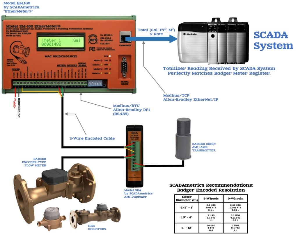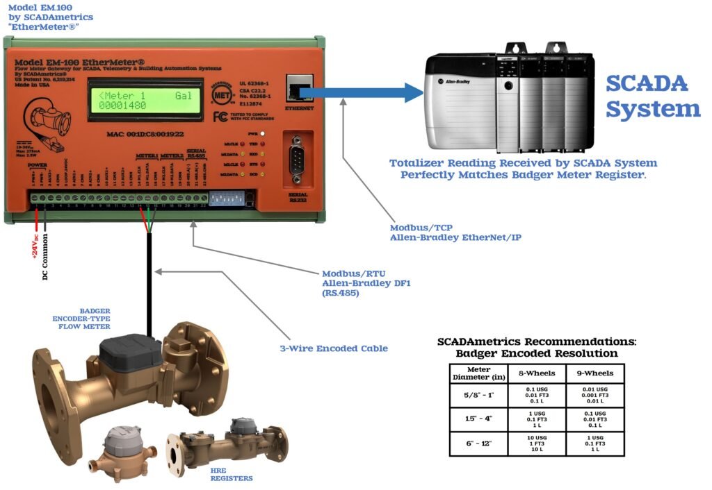 The gold standard of SCADA connectivity for a flow meter is transmission of the “true” meter reading into the SCADA system with zero error. We call that “revenue-grade accuracy”. The following illustrates how a Badger flow meter can be enhanced to provide advanced SCADA signaling (Modbus, Allen-Bradley EtherNet/IP). Excellent for custody-transfer pumping and valve stations where revenue-grade accuracy is of paramount importance. Also excellent for military bases and educational facilities. Design Basis: Model EM.100 EtherMeter: