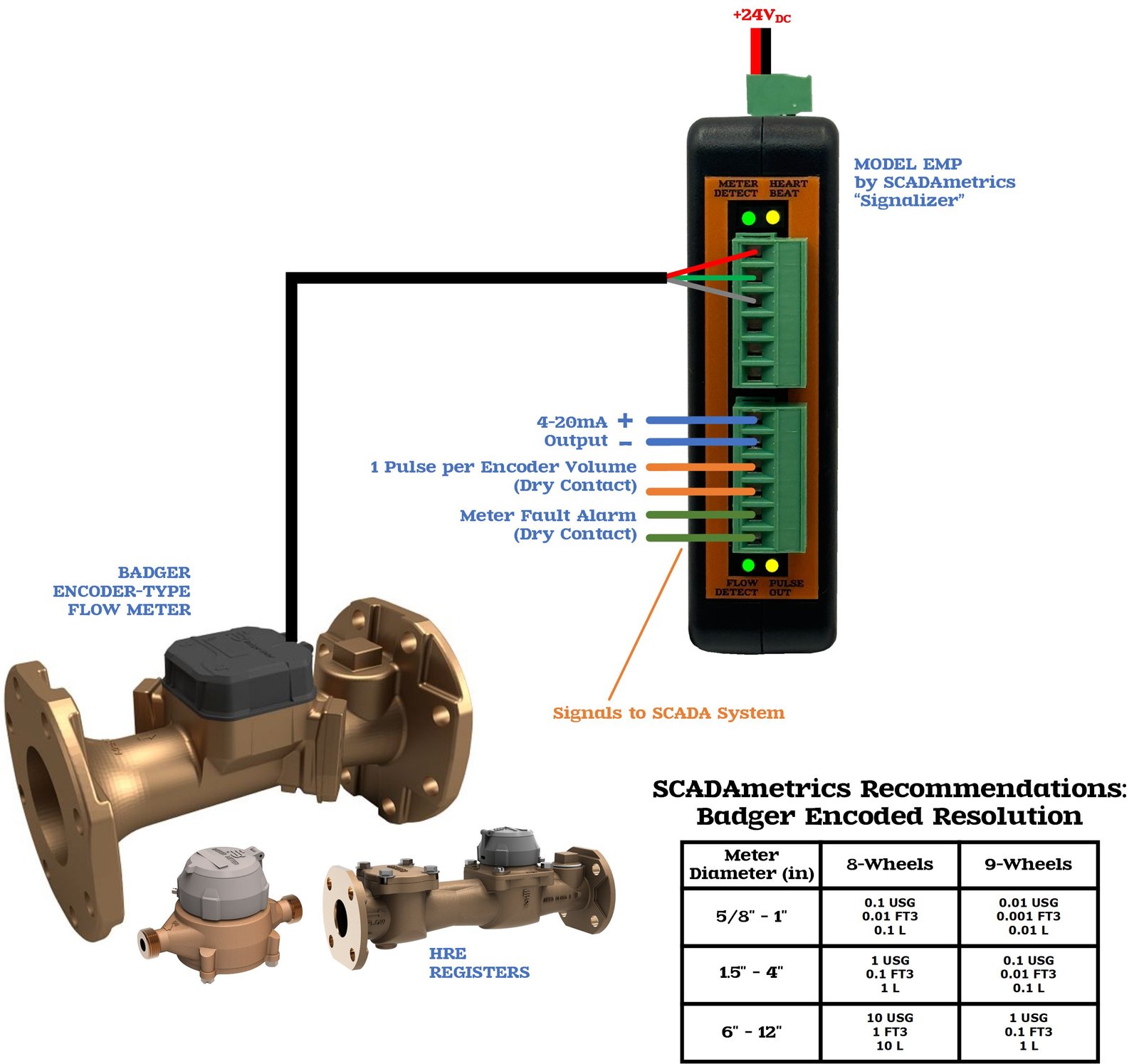 The following illustrates how an encoded-only Badger flow meter can provide basic SCADA signaling (4-20 milliamp, pulse-per-volume, meter fault alarm). Excellent for well and pumping stations, as well as commercial building submetering. Design Basis: Model EMP Signalizer: