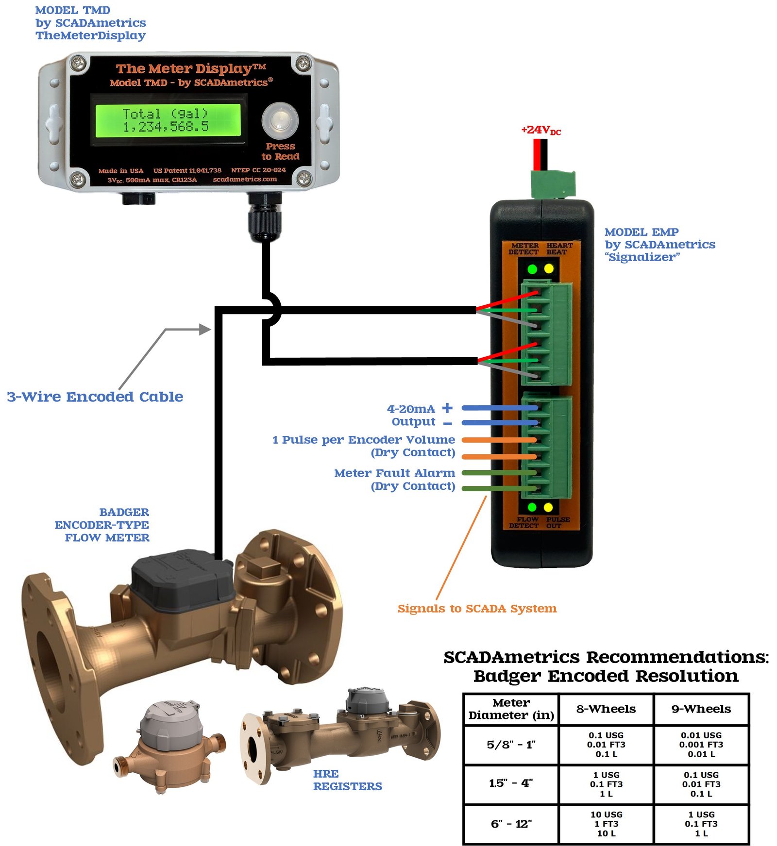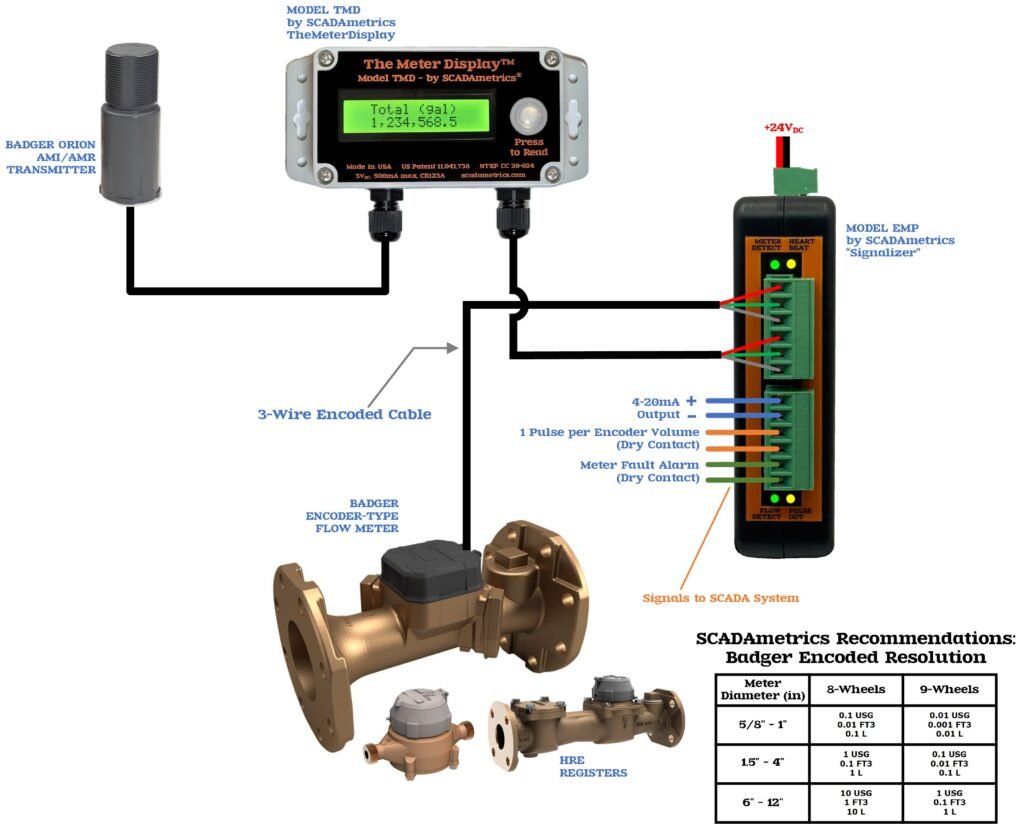 Like many manufacturers of AWWA-style flow meters, Badger’s signaling options are focused upon their 3-wire, encoded protocol for interfacing with AMI/AMR endpoints. However, Badger also offers pulse and 4-20mA SCADA signaling options, as well. Badger’s 3-wire encoded protocol implementation is capable of transmitting 9-digit, fine-resolution totalization information — which SCADAmetrics instrumentation leverages to generate additional industrial signal and display options — thereby providing an extended ability to solve the unique challenges facing the SCADA, Telemetry, and Building Automation spheres.