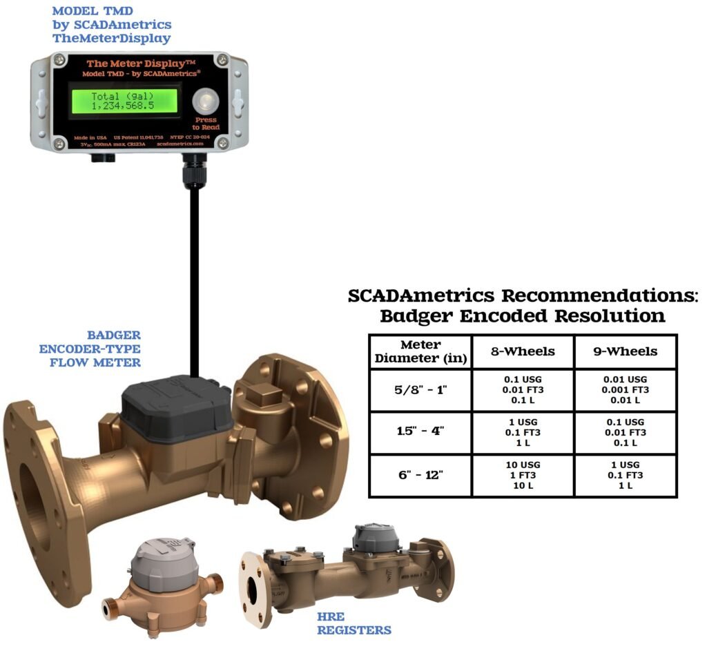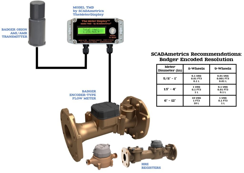 The following illustrates how a model TMD display can work with a Badger flow meter to provide AMI signaling to the water utility, while concurrently providing a visual remote display whose reading is a perfect match to the Badger meter register total. Furthermore, if the Badger register is programmed for 8 or 9 digit resolution, then this fine resolution will enable the display of rate-of-flow (GPM, lpm), as well. Excellent for utility-owned water meters at commercial and industrial buildings, where the building owner desires a meter reading without requiring entry to a vault or confined-space. Design Basis: SCADAmetrics Model TMD TheMeterDisplay. Coming soon! — TMD Support for Badger E-Series advanced alarm flags (Temperature & Pressure).