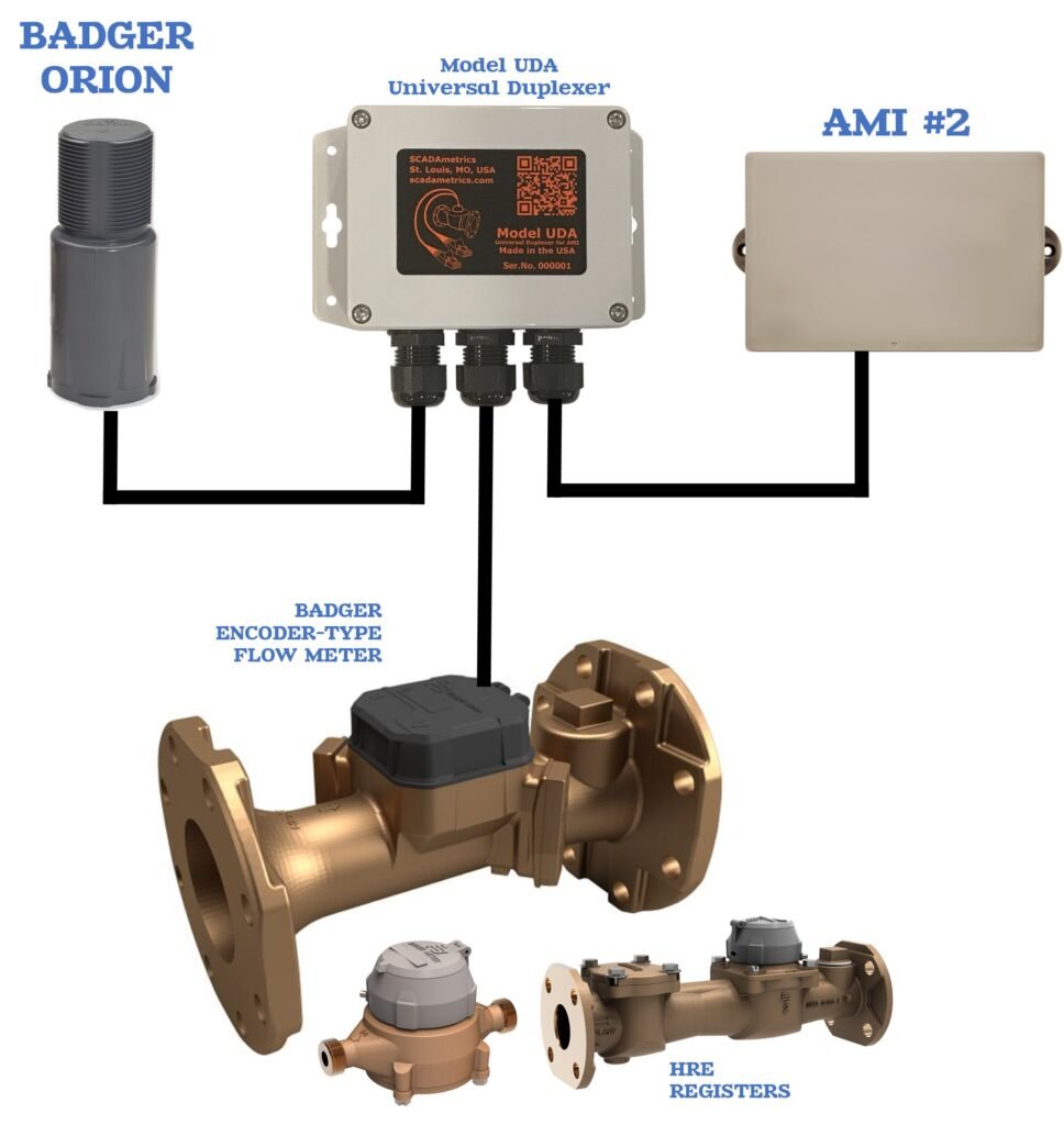 The following illustrates how a Badger flow meter can provide AMI signaling to two separate systems. Excellent for custody-transfer stations, where both the water buyer and seller desire meter connectivity to their separate respective AMI systems. Design Basis: SCADAmetrics Model UDA Universal Duplexer for AMI: