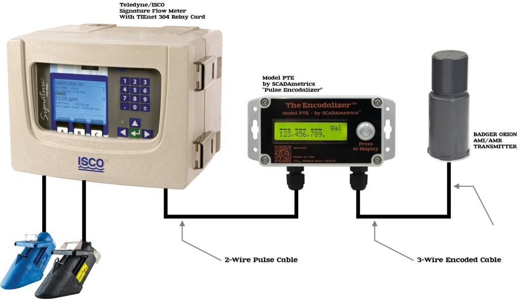 The following illustrates how a model PTE Pulse Encodalizer™ can transform a pulse-type flow meter into an Orion-compatible encoder-type flow meter. Excellent for wastewater lift stations, irrigation points-of-sale, sewer deduct meters, natural gas meters. Design Basis: SCADAmetrics Model PTE Pulse Encodalizer: